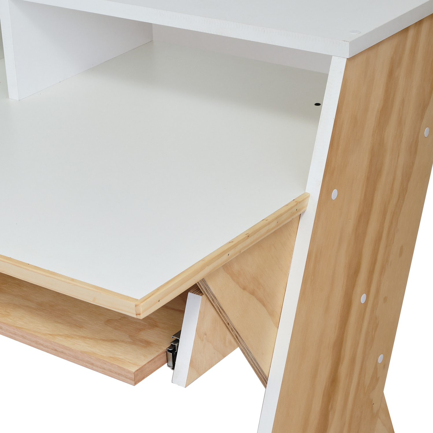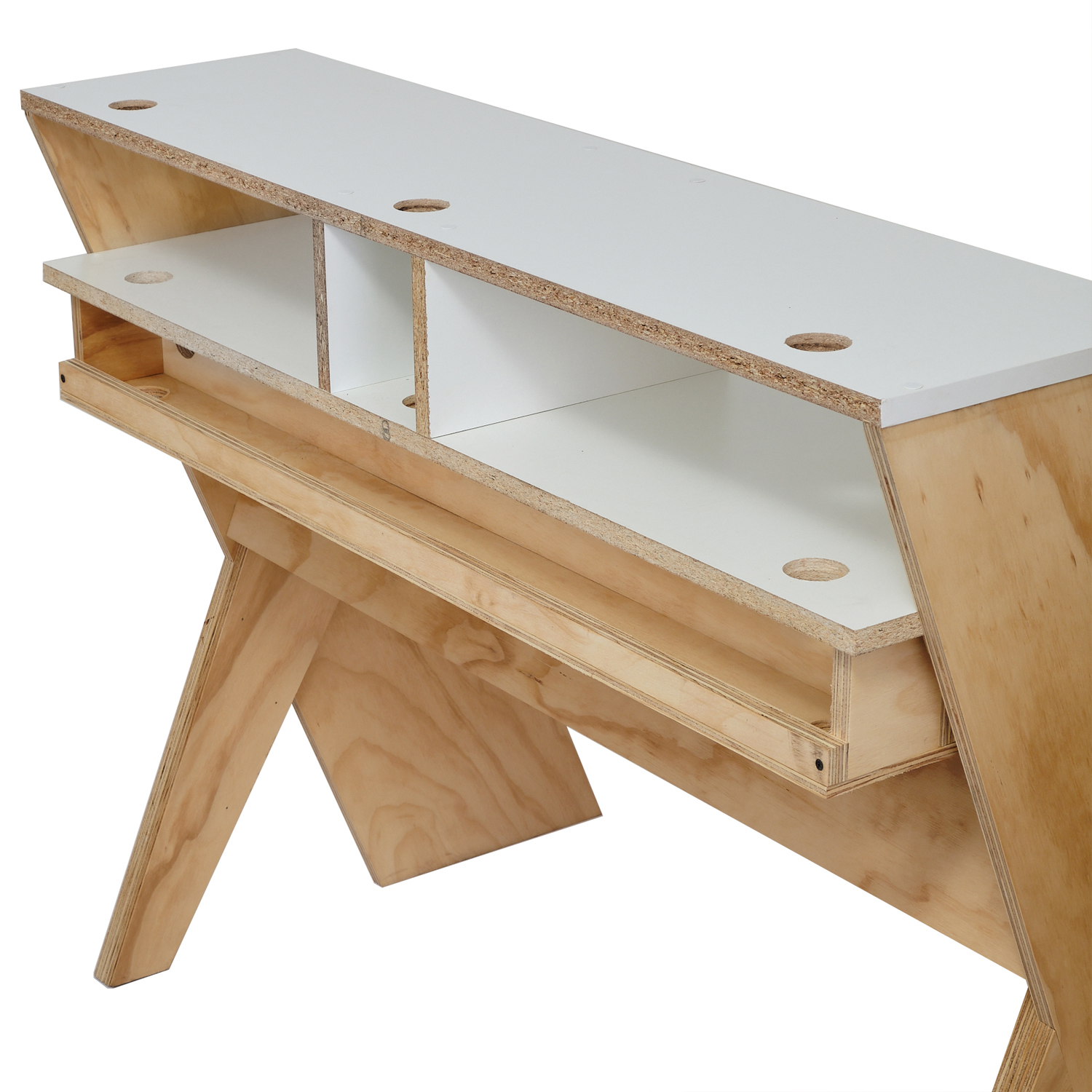 Mueble de lujo para trabajo de producción musical en casa. Plataformas de trabajo en melamina blanca, estructura en terciado impregnado tono natural y detalles de madera en los bordes. El tercer nivel es telescópico con riel.